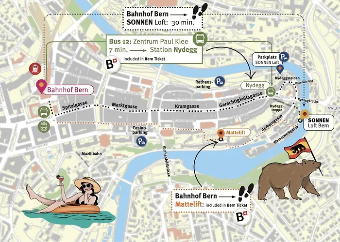 - ❓Jsou v blízkosti apartmán Sonnen Loft Bern apartmán nějaké turistické památky?Mezi atrakce v blízkosti apartmán Sonnen Loft Bern apartmán patří Medvědí příkop a travelling musician.